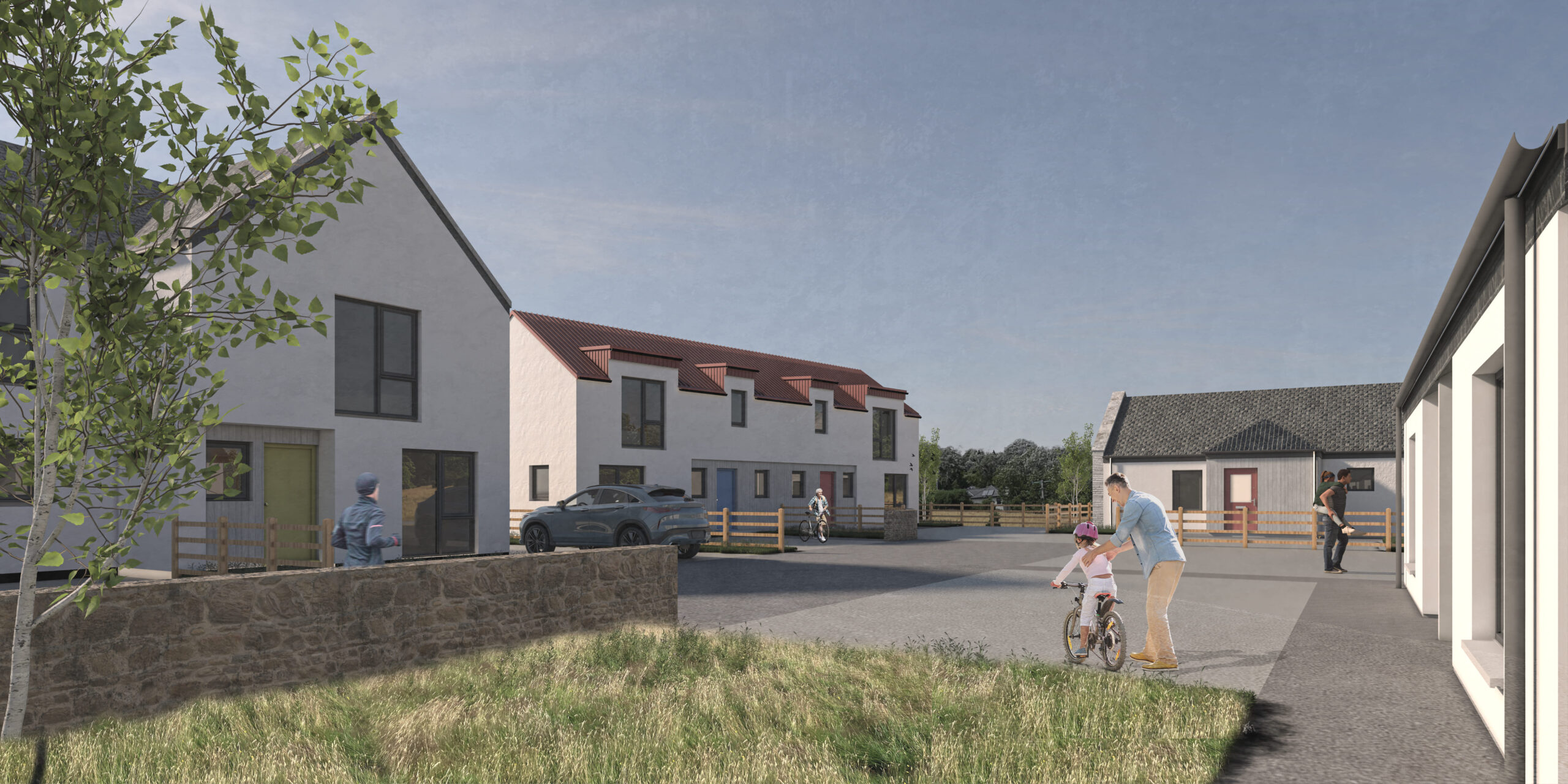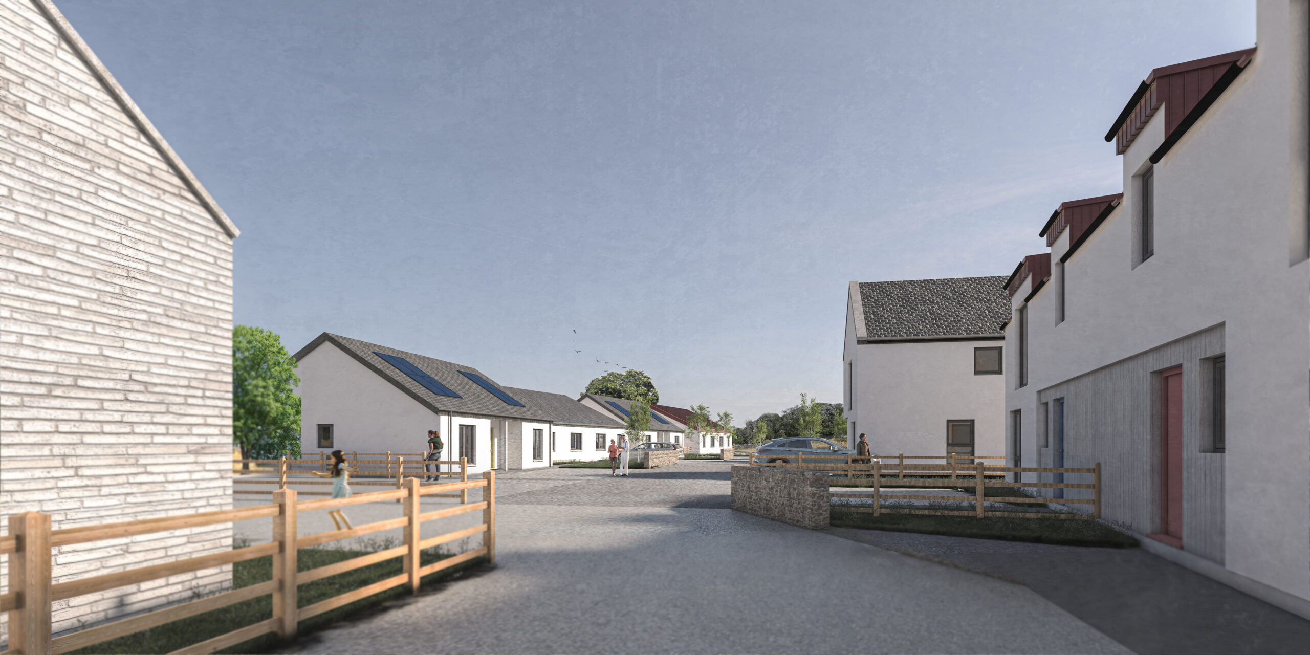 Rather than adopting a conventional suburban layout, the design approach considered the site as a place-led rural setting. The arrangement of the houses was developed in an informal manner, allowing the buildings themselves to inform the alignment of the road and shared spaces. This approach enabled the creation of a more organic, place-centred layout that reflects the character of the landscape and fosters a strong sense of community.