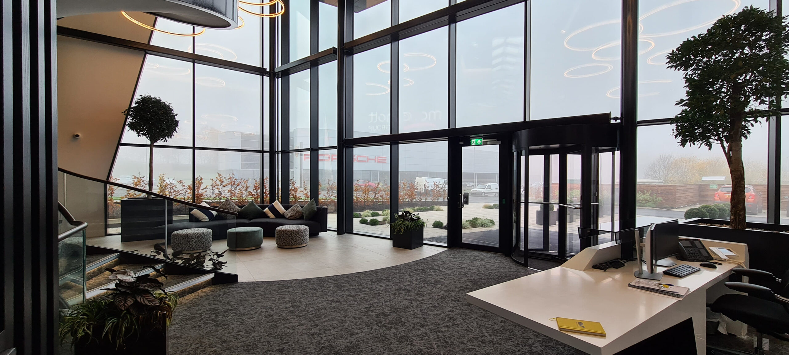 The building has also been carefully designed to respond to the site’s natural topography. A split-level arrangement allows a small garage to be integrated into the lower part of the site, while the main entrance opens into a double-height atrium that creates a strong first impression for visitors. At the upper level, a boardroom with full-height corner glazing has been strategically positioned to face the A9, taking advantage of views and ensuring the building presents a confident presence within its wider context.