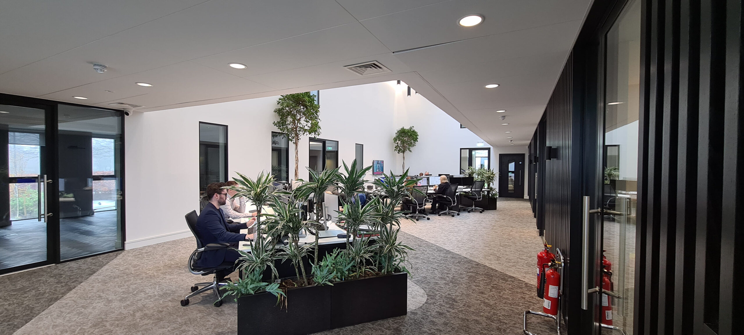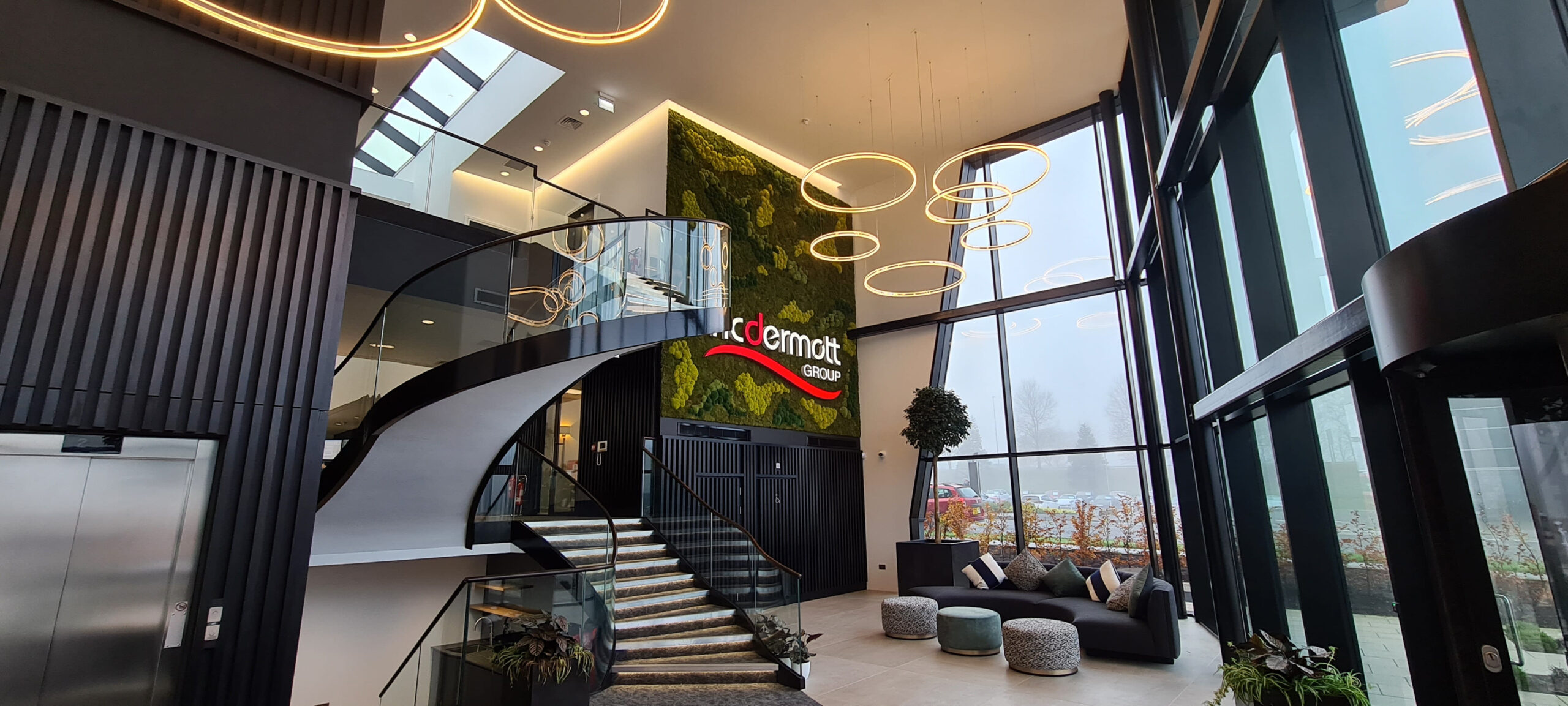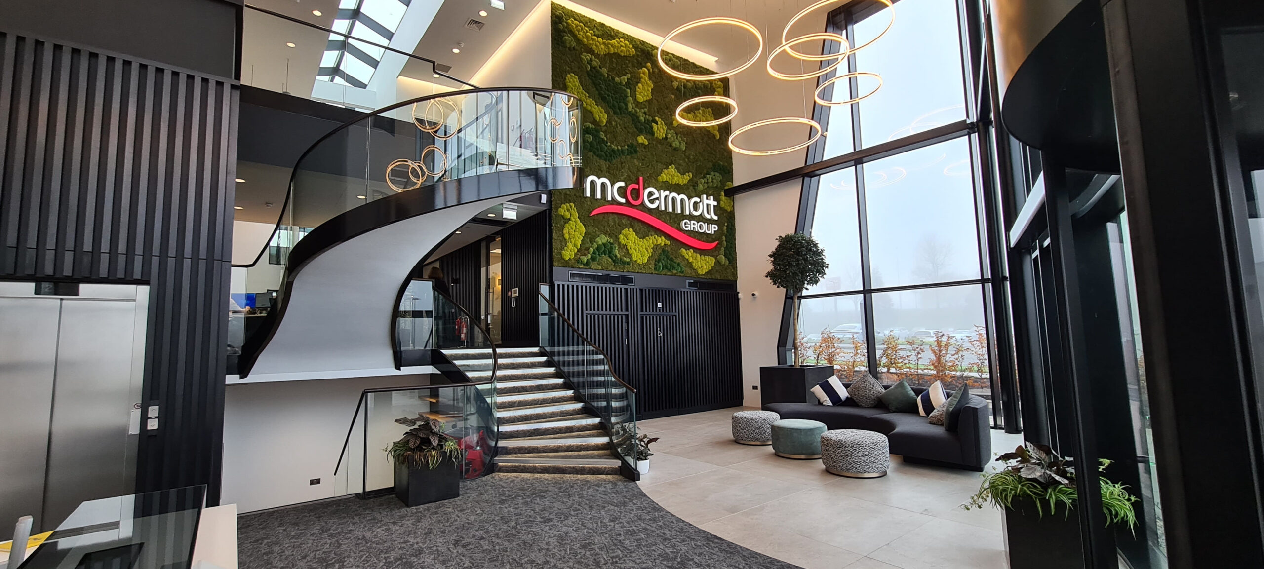 A key ambition of the project has been to achieve the international WELL Gold Standard, placing the wellbeing of building occupants at the forefront of the design and construction process. Central to this concept is a dramatic entrance atrium featuring a bespoke spiral staircase that rises from the ground floor to the upper levels. Running alongside it is an eight-metre-high moss wall, introducing a strong biophilic element that enhances both the visual impact of the space and the overall wellbeing of occupants.