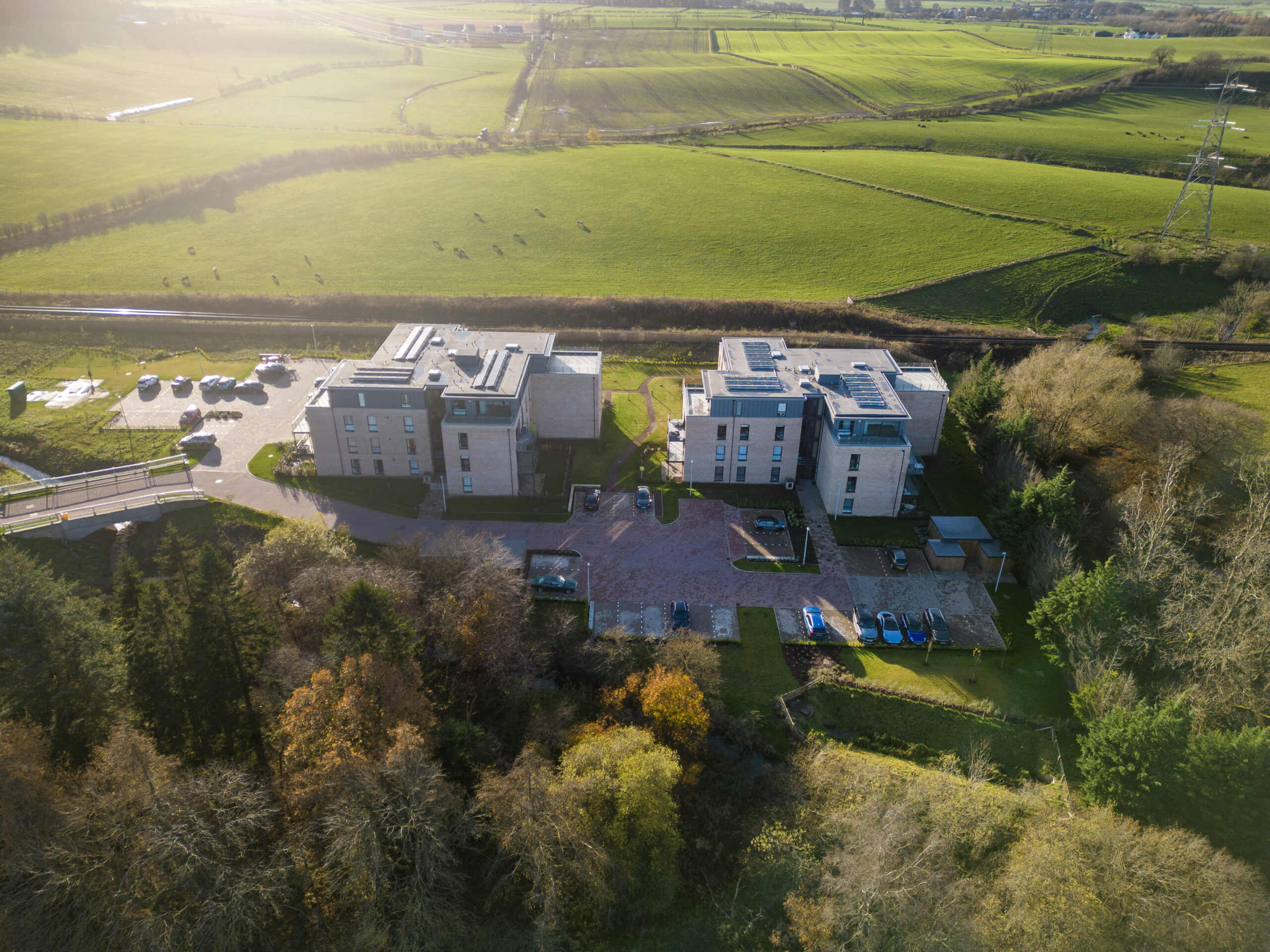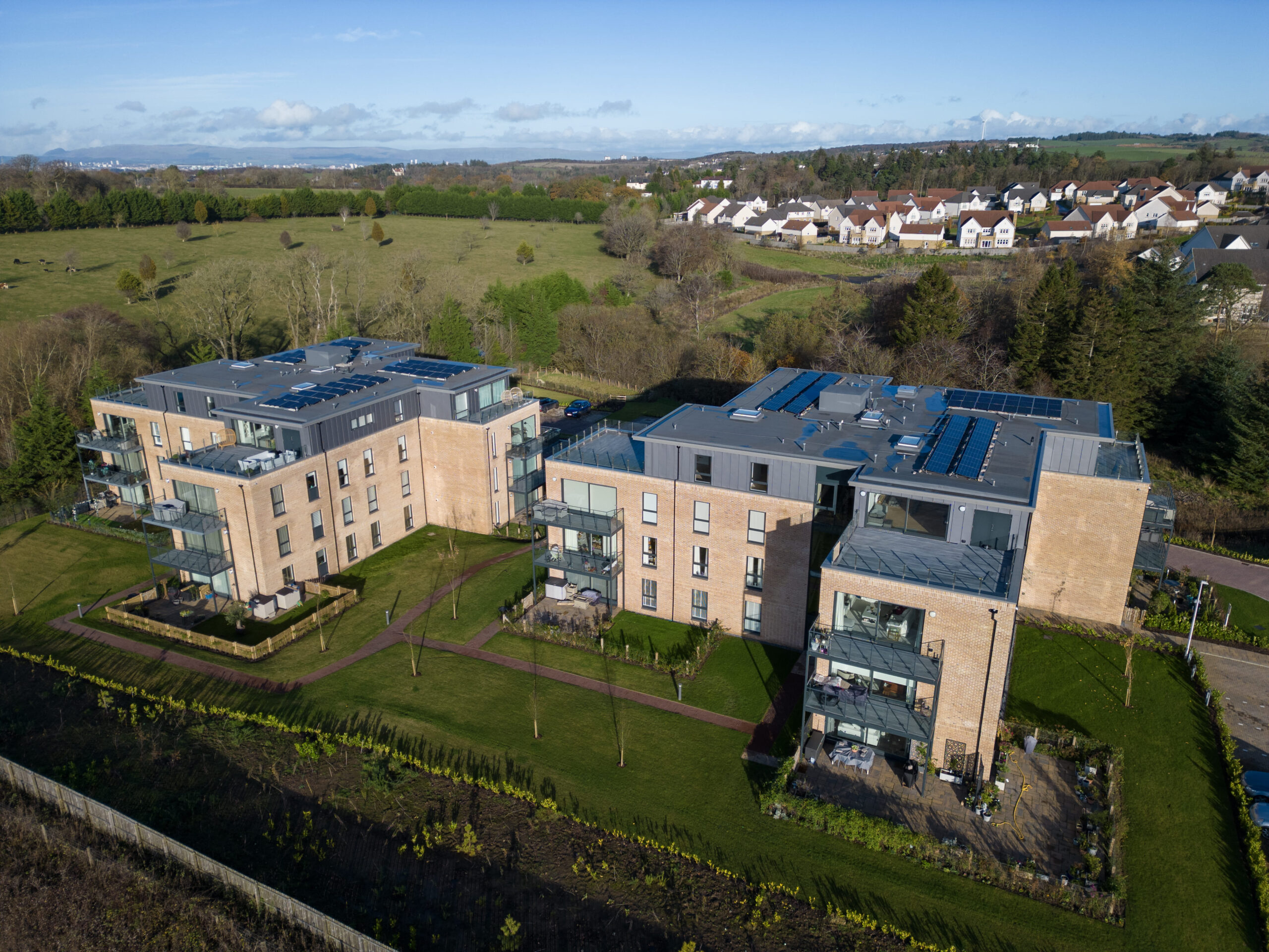 Thorntonhall, located just south of Glasgow, is characterised by its historic village setting and its connection to the wider rural environment. CRGP’s architectural response was informed by this context, balancing the village’s established character with the requirements of modern living. Although the location is peaceful and predominantly residential, it remains well connected through regular rail links to Glasgow Central and nearby motorway routes to both Glasgow and Prestwick airports. These contextual factors helped shape the design approach, ensuring the development complements its setting while providing high‑quality contemporary homes.